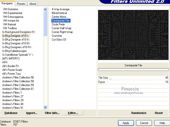 Effetti>Plugins>Filters Unlimited 2.0 - &<Bkg Designer sf10I> - Centripedal Tile, con i settaggi standard.