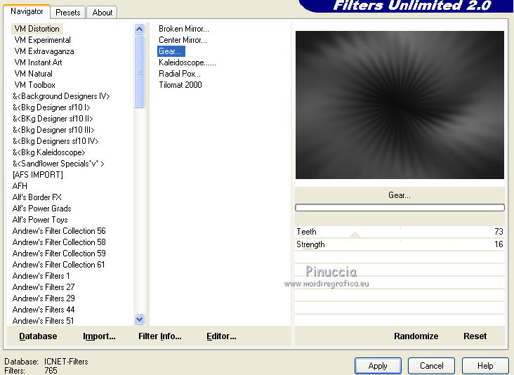 2. Effetti>Plugins>Filters Unlimited 2.0 - VM Distortion – Gear, con i settaggi standard.