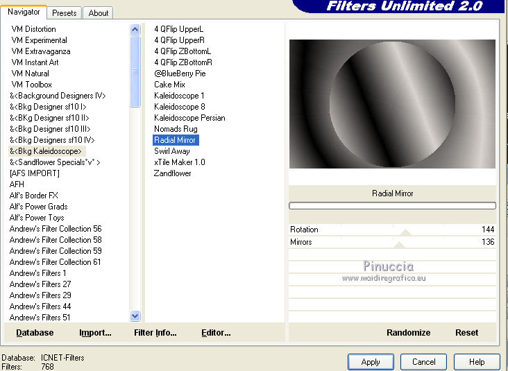 Effetti>Plugins>Filters Unlimited 2.0 - &<Bkg Kaleidoscope> - Radial Mirror.