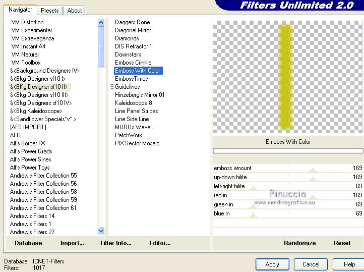 Effetti>Plugins>Filters Unlimited 2.0 – &<Bkg Designer sf10II> – Emboss with Color, con i settaggi standard.