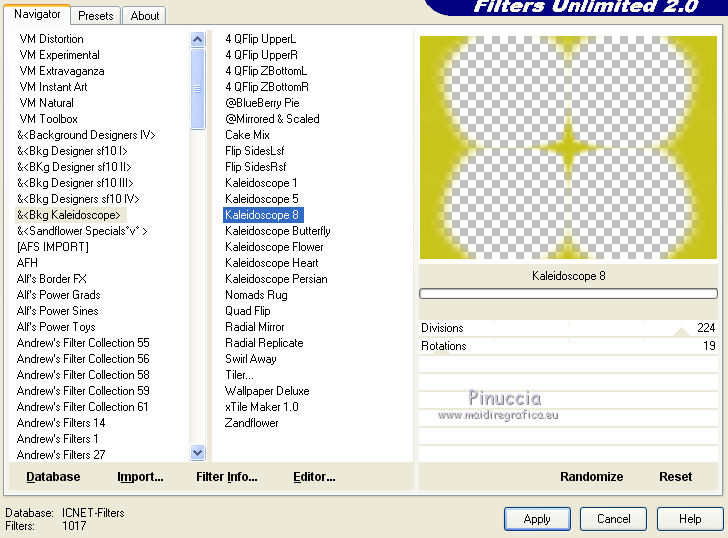 Effetti>Plugins>Filters Unlimited 2.0 – &<Bkg Kaleidoscope> - Kaleidoscope 8, con i settaggi standard.