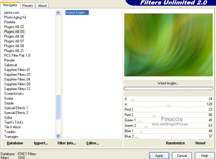 Effetti>Plugins>Filters Unlimited 2.0 - Plugins AB 03 - Weird Angles, con i settaggi standard.
