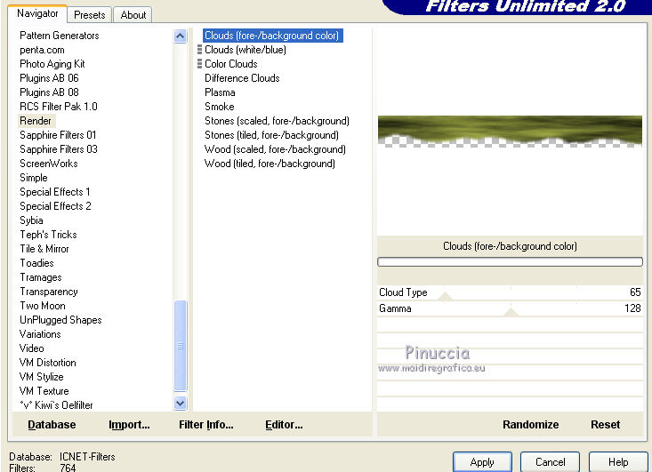 Effetti>Plugins>Filters Unlimited 2.0 - Render – Clouds(fore-/background color), con i settaggi standard.