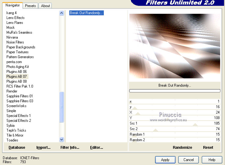 Effetti>Plugins>Filters Unlimited 2.0 – Plugins AB 07 – Break Out Randomly, con i seguenti settaggi.