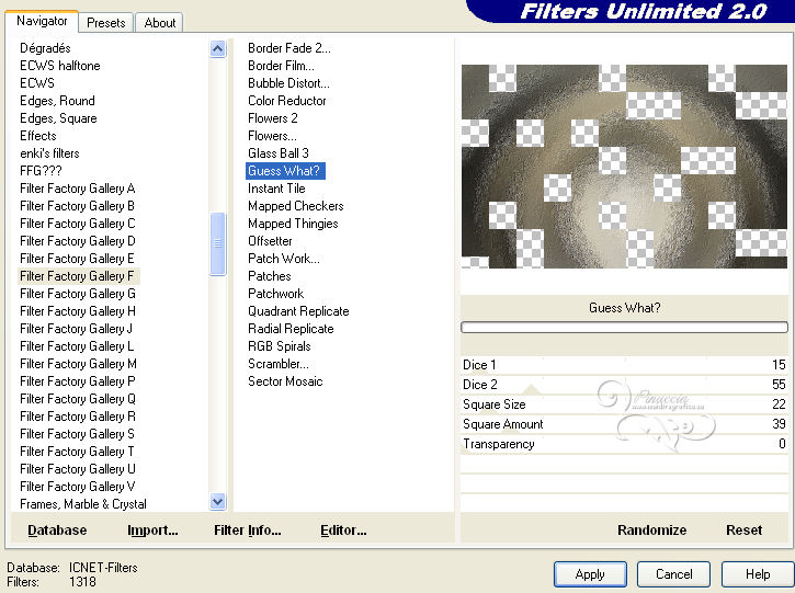 Effetti>Plugins>Filters Unlimited 2.0 – Filter Factory F – Guess What?, con i settaggi standard.