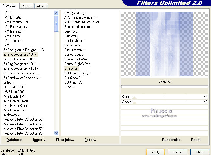 Effets>Plugins>Filters Unlimited 2.0 - &<Bkg Designer sf10I> - Cruncher.