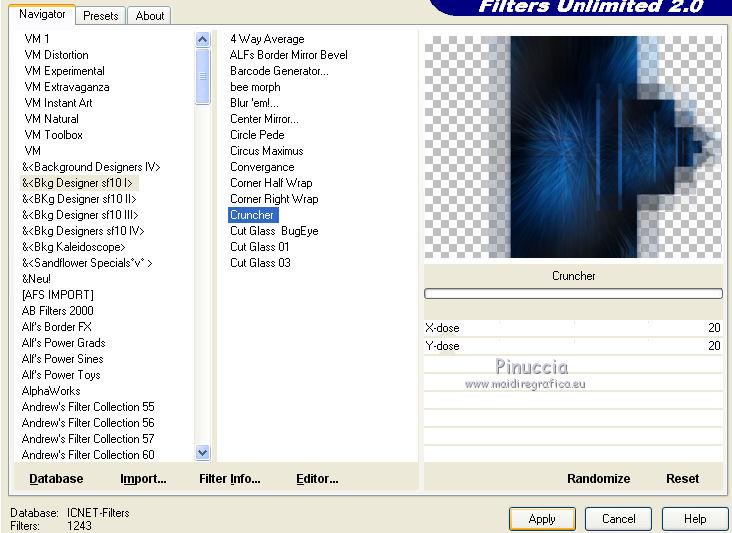 Effects>Plugins>Filters Unlimited 2.0 - &<Bkg Designer sf10I> - Cruncher.