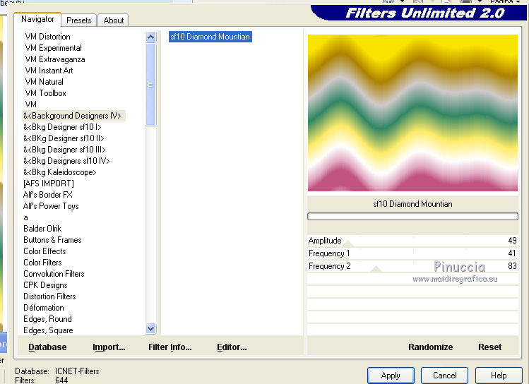 Effets>Modules Externes>Filters Unlimited 2.0 - &<Background Designer IV> - sf10 Diamond Mountain.