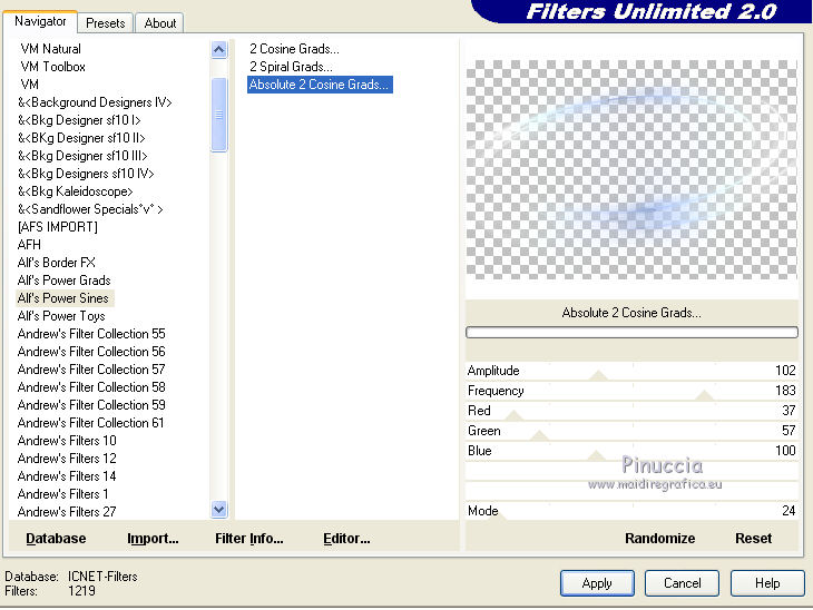 21. Effets>Modules Externes>Filters Unlimited 2.0 - Alf's Power Sines – Absolute 2 Cosine Grads.