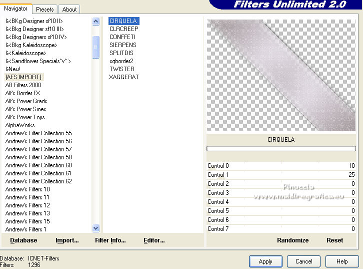10. Effets>Modules Externes>Filters Unlimited 2.0 - AFS IMPORT - Cirquela, par défaut.
