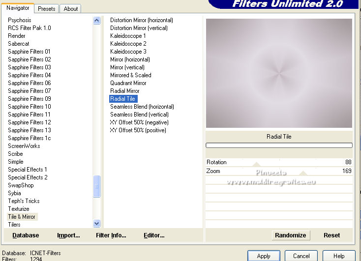 Effets>Modules Externes>Filters Unlimited 2.0 - Tile & Mirror - Radial Tile.