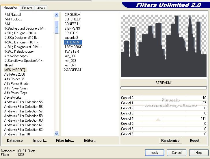 4. Effets>Modules Externes>Filters Unlimited 2.0 - AFS IMPORT - STREAKMI, par défaut.
