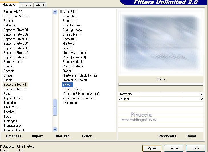 16. Effets>Modules Externes>Filters Unlimited 2.0 - Special Effects 1 - Shiver, par défaut - 2 fois.