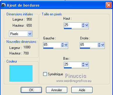 4. Image>Ajouter des bordures, symétrique décoché, couleur d'avant plan #48ddff.