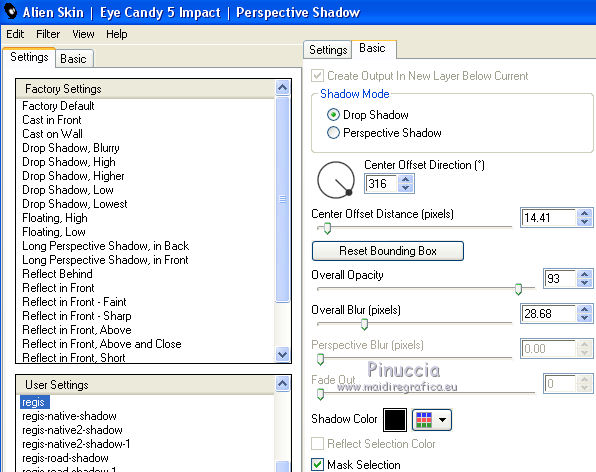 Effets>Modules Externes>Alien Skin Eye Candy 5 Impact - Perspective Shadow - preset regis.