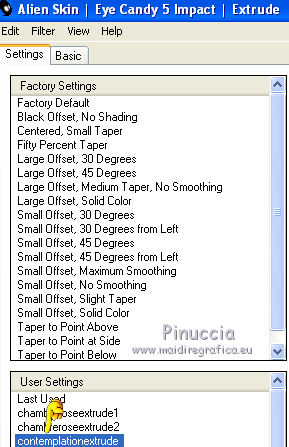 Metti il preset conteplationextrude nella cartella del filtro: Alien Skin Eye Candy 5 Impact>Settings>Extrude. Se preferisci puoi importarlo, quando ti servirà, dalla cartella in cui hai scompattato il materiale.