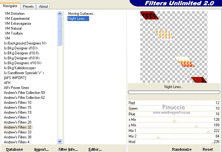 Effetti>Plugins>Filters Unlimited - Andrew's Filter 32 - Night Lines, con i settaggi standard.