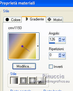 Passa il colore di primo piano a Gradiente e seleziona il gradiente cmv1193, stile Lineare, con i seguenti settaggi.