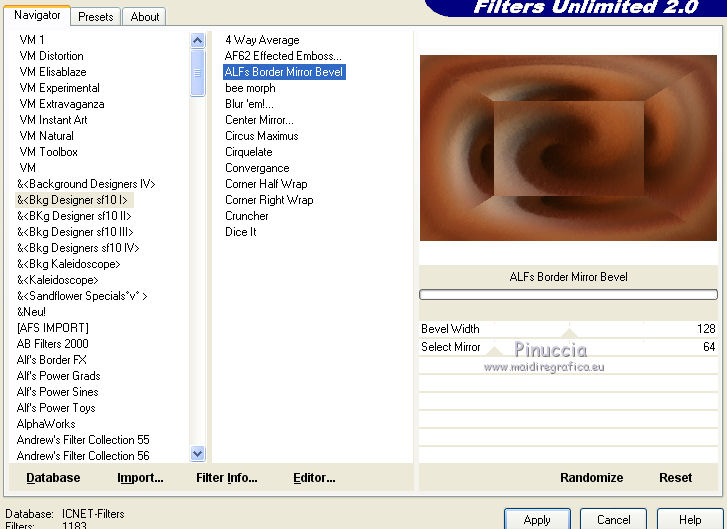 6. Effetti>Plugins>Filters Unlimited 2.0 - &<Bkg Designer sf10I> - Alf's Border Mirror Bevel, con i settaggi standard.