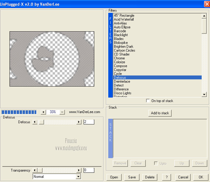 Effetti>Plugins>VanDerLee - Unplugged-X - Defocus, con i settaggi standard.