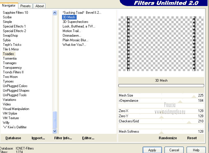 Effetti>Plugins>Filter Unlimited 2.0 - Toadies - 3D Mesh, con i settaggi standard.