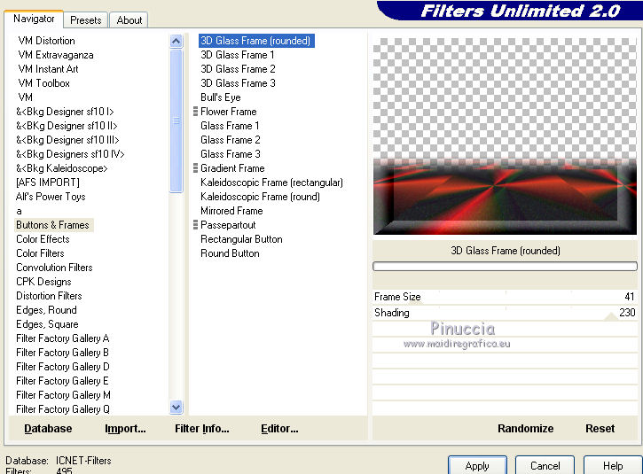 Effects>Plugins>Filters Unlimited 2.0 - Buttons &Frames - 3D Glass Frame (rounded).