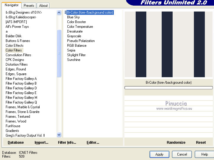 3. Effects>Plugins>Filters Unlimited 2.0 - Color Filters - Bi-Color (fore-/background color)