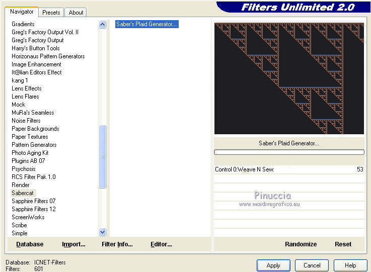 4. Effects>Plugins>Filters Unlimited 2.0 - Sabercat - Saber's Plaid Generator.