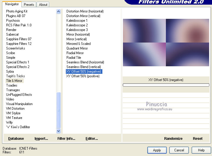 4. Effetti>Plugins>Filters Unlimited 2.0 - Tile & Mirror - XY Offset 50% (Negative)