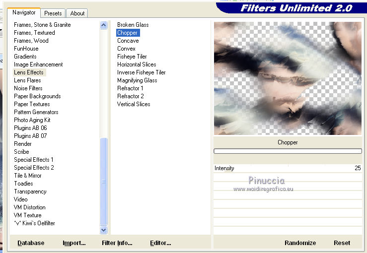 8. Effetti>Plugins>Filters Unlimited 2.0 - Lens Effects - Chopper, con i settaggi standard.