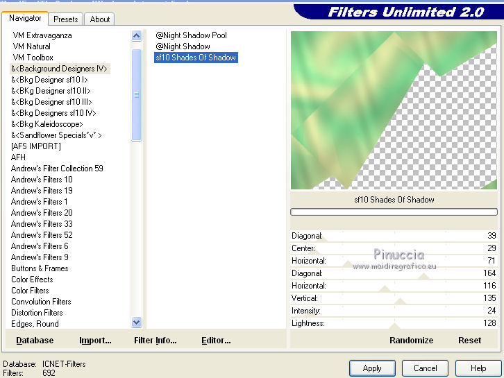 8. Effetti>Plugins>Filters Unlimited - Background designers IV - sf10 Shades of Shadow, con i settaggi standard.