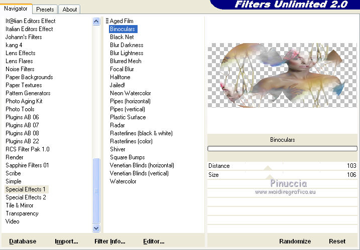 7. Effetti>Plugins>Filters Unlimited 2.0 - Special Effects 1 - Binoculars, con i settaggi standard.