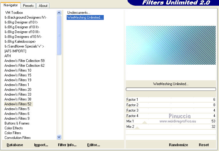 10. Effetti>Plugins>Filters Unlimited - Andrew's Filter 52 - WireMeshing Unlimited, con i settaggi standard.