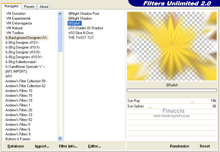 7. Effetti>Plugins>Filters Unlimited 2.0 - Background DesignersIV - Splish, con i settaggi standard.