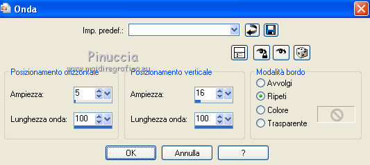 15. Effetti>Effetti di distorsione>Onda - 2 volte con i seguenti settaggi.