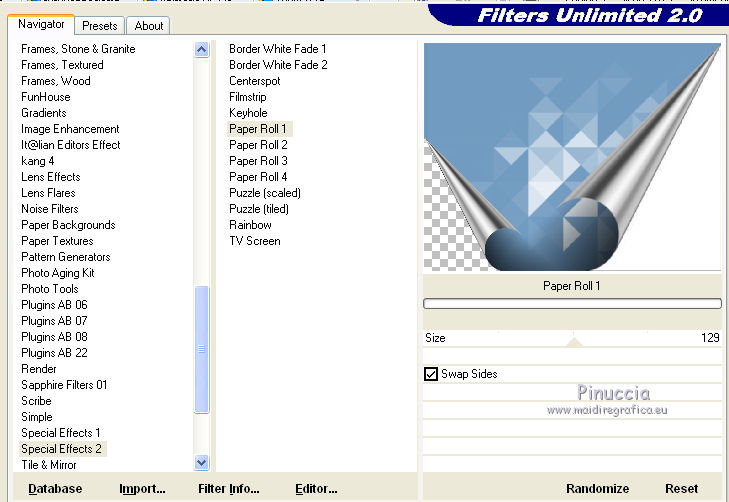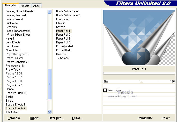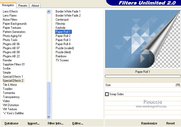 6. Effetti>Plugins>Filters Unlimited 2.0 - Special Effects 2 - Paper Roll 1, con i settaggi standard.