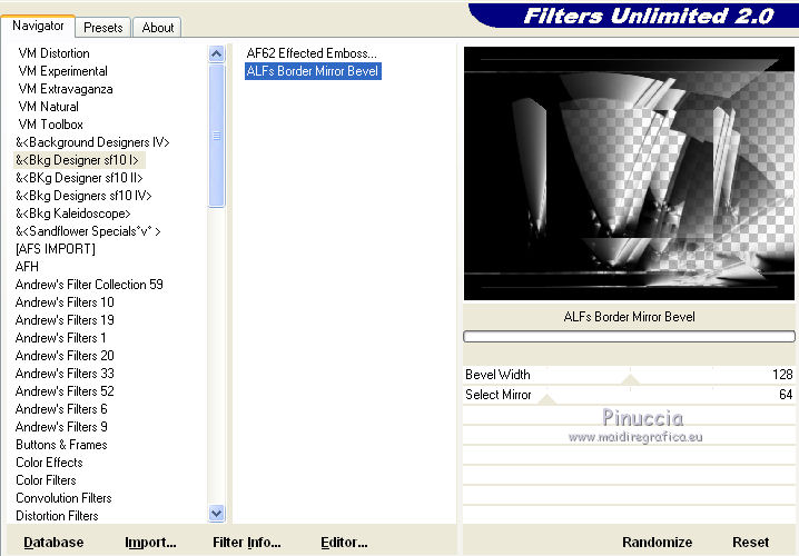 4. Effetti>Plugins>Filters Unlimited 2.0 - Bkg Designer sf10I - Alf's Border Mirror bevel, con i settaggi standard.