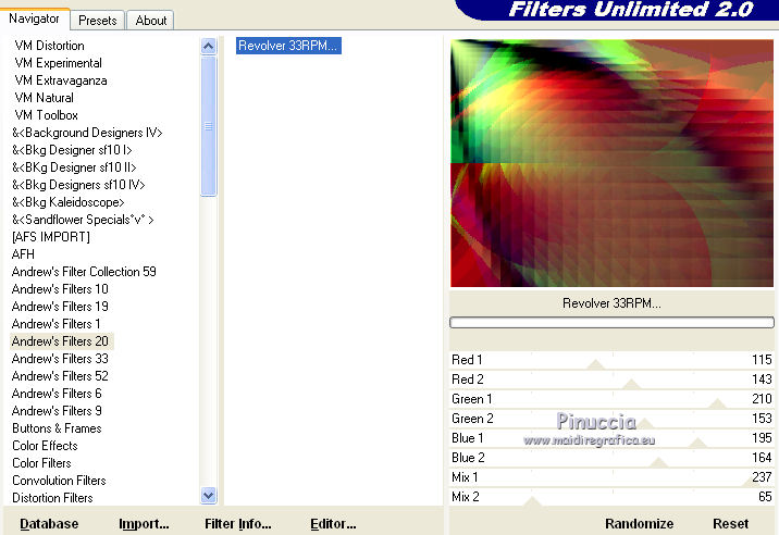 4. Effetti>Plugins>Filters Unlimited 2.0 - Andrew's 20 - Revolver 33Rpm, con i settaggi standard.