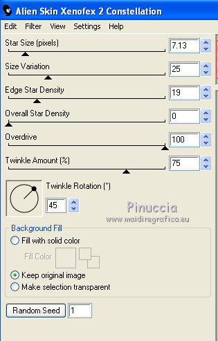 Effetti>Plugins>Alien Skin Xenofex 2.0 - Constellation, clicca una volta su Random Seed e ok.