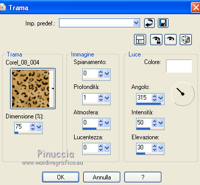 13. Effetti>Effetti di trama>Trama - seleziona la trama Corel_08_004 con i seguenti settaggi.