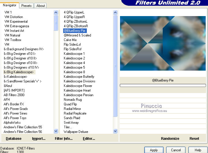 5. Effetti>Plugins>Filters Unlimited 2.0 - &<Bkg Kaleidoscope> - @Blueberry Pie.