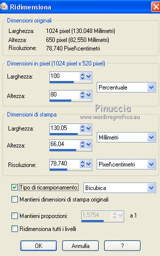 14. Immagine>Ridimensiona, 100 x 80%, tutti i livelli e mantieni proporzioni non selezionati.