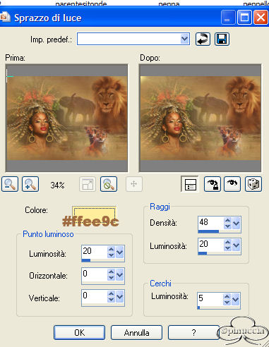 17. Effetti>Effetti di illuminazione>Sprazzo di luce, con i seguenti settaggi, colore di primo piano.