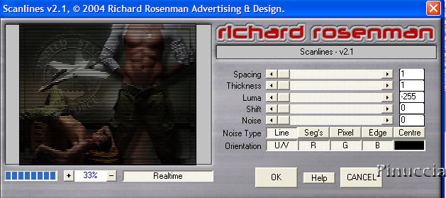 Effetti>Plugins>Richard Rosenman - Scanlines, con i settaggi standard.