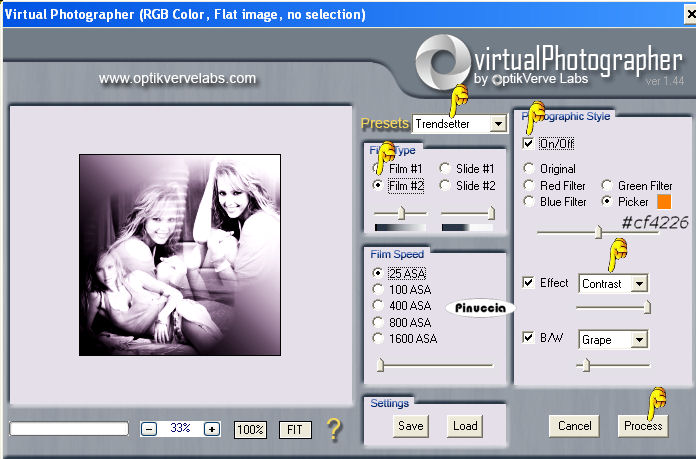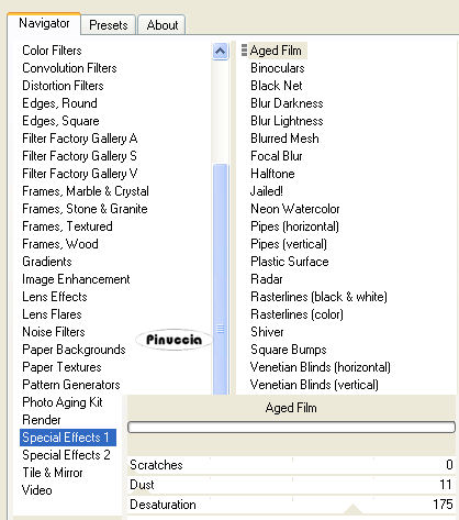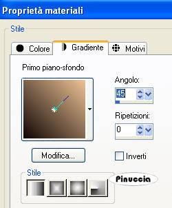 qui puoi trovare qualche risposta ai tuoi dubbi. Se l'argomento che ti interessa non è presente, ti prego di segnalarmelo. Questo tutorial è stato realizzato con PSP X, ma può essere eseguito anche con PSP 9. Occorrente: Materiale qui Metti la maschera nella cartella maschere. Apri il font e minimizzalo nella tua area di lavoro. Lo troverai nella lista dei font disponibili, quando ti servirà. Filtri: Filters Unlimited 2.0 qui Optikverve Labs qui 1. Apri le due immagini che hai trovato nello zip del materiale. Duplicale con shift+D e chiudi gli originali. 2. Apri una nuova immagine trasparente 600 x 600 pixels. 3. Imposta il colore di primo piano con #110706, e il colore di sfondo con #edc294. Passa il colore di primo piano a Gradiente di primo piano/sfondo, con i seguenti settaggi: ![]() ![]() 4. Riempi l'immagine trasparente con questo gradiente.5. Apri la prima immagine "Alba9". 6. Livelli>Carica/Salva maschera>Carica maschera da disco: cerca e carica la maschera 20-20: ![]() Livelli>Unisci>Unisci gruppo. Modifica>Copia. 7. Torna al tuo lavoro e vai a Modifica>Incolla come nuovo livello. Spostala in basso a sinistra.8. Apri la seconda immagine "alba10" e ripeti il passo 6. Torna al tuo lavoro e vai a Modifica>Incolla come nuovo livello. Sposta questa immagine sopra la prima, più o meno come mostrato nella schermata sotto:![]() 9. Livelli>Duplica. Immagine>Rifletti. Sposta l'immagine duplicata in alto a destra.![]() Livelli>Unisci>Unisci tutto (appiattisci). 10. Effetti>Plugins>Optikverve lab - Virtual Photographer: ![]() 11. Effetti>Plugins>Filters Unlimited 2.0 - Edges Square - Square Edge 11. 12. Effetti>Plugins>Filters Unlimited 2.0 - Special Effects 1 - Aged Film, con i seguenti settaggi: ![]() Livelli>Nuovo livello raster. 13. Attiva lo strumento Testo .Imposta il colore di sfondo con #ffecdb. Chiudi il colore di primo piano. Seleziona il font Ce la luna, dimensione a tuo piacimento, larghezza pennellata 0, e firma la tua tag in basso a destra. ![]() 14. Effetti>Effetti 3D>Sfalsa ombra, con i seguenti settaggi: ![]() Selezione>Deseleziona. 15. Nella paletta dei livelli cambia la modalità di miscelatura di questo livello in Luminanza (Esistente), e abbassa l'opacità al 32%. ![]() Livelli>Nuovo livello raster. 16. Imposta il colore di primo piano con #523829, e lascia #ffecdb come colore di sfondo. Con lo stesso font (dimensione a tua scelta), pennellata 1, scrivi "Alba" in alto a sinistra (vedi la tag finale). 17. Effetti>Effetti 3D>Sfalsa ombra, con i settaggi precedenti. Selezione>Deseleziona. Cambia la modalità di miscelatura di questo livello in Luminanza (esistente). Livelli>Nuovo livello raster. 18. Lascia il colore #ffecdb come colore di sfondo e chiudi il colore di primo piano. Con il font Verdana (dimensione a tuo piacimento), scrivi l'indirizzo del tuo sito, (se non hai un sito, puoi saltare questo passaggio). Immagine>Ruota per gradi, 90 gradi a sinistra. ![]() Sposta il testo in alto a sinistra (vedi la tag finale). Livelli>Unisci>Unisci tutto (appiattisci). 19. Immagine>Aggiungi bordatura, 2 pixels, simmetriche, con il colore #ffecdb. Immagine>Aggiungi bordatura, 2 pixels, simmetriche, con il colore #523829. ![]() Se hai problemi o dubbi, o trovi un link non funzionante, o anche soltanto per un saluto, scrivimi. 20 Luglio 2007 |