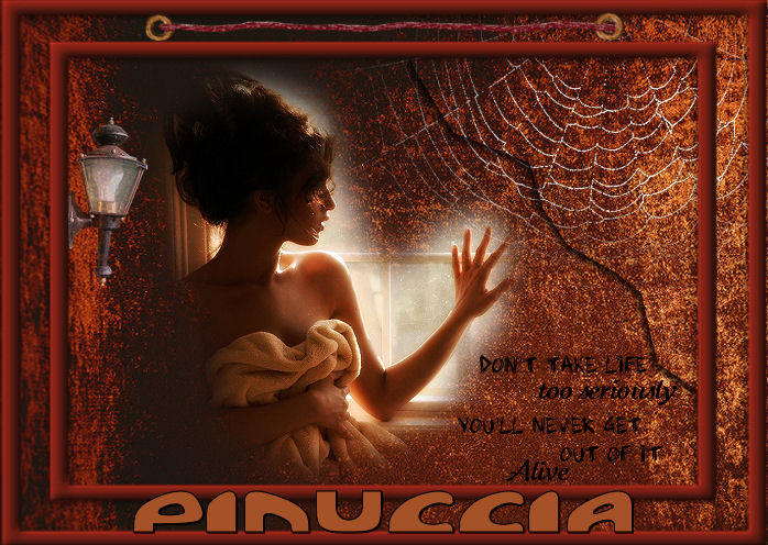 qui puoi trovare qualche risposta ai tuoi dubbi. Se l'argomento che ti interessa non è presente, ti prego di segnalarmelo. Materiale qui Apri tutti i tubes in PSP. Apri il file di sfondo "BackgroundAlive" e vai a Modifica>Copia e poi Modifica>Incolla>Incolla come nuova immagine. Continuerai a lavorare su questa immagine. Puoi chiudere l'originale. Apri il tube "BorderAlive" e vai a Modifica>Copia. Torna al tuo lavoro e vai a Modifica>Incolla>Incolla come nuovo livello. Posizionati sul livello dello sfondo (Raster 1). Apri il tube della donna "Somedaysareharder_joluvsdogs" e vai a Modifica>Copia. Torna al tuo lavoro e vai a Modifica>Incolla>Incolla come nuovo livello. Spostalo un po' a sinistra.Apri il tube "Marif_2006_octobre_misted_toile_araignee". Posizionati sul livello inferiore (non preoccuparti se ti sembrerà vuoto: è soltanto bianco) e vai a Modifica>Copia. Torna al tuo lavoro e vai a Modifica>Incolla>Incolla come nuovo livello. Spostalo nell'angolo in alto a destra.Apri il tube CornerAlive e vai a Modifica>Copia. Torna al tuo lavoro e vai a Modifica>Incolla>Incolla come nuovo livello. Spostalo nell'angolo in alto a destra della cornice interna.![]() Apri il tube Lamp01-shel e vai a Modifica>Copia. Torna al tuo lavoro e vai a Modifica>Incolla>Incolla come nuovo livello. Spostalo a sinistra contro il bordo.Abbassa l'opacità di questo livello al 70%. ![]() Apri il tube Scraptube45 e vai a Modifica>Copia. Torna al tuo lavoro e vai a Modifica>Incolla>Incolla come nuovo livello. Spostalo in alto tra le due cornici.Apri il file di testo "1WordArtPSP" e vai a Modifica>Copia. Torna al tuo lavoro e vai a Modifica>Incolla>Incolla come nuovo livello. Spostalo in basso a destra.E' tutto a posto? Se vuoi sistemare meglio gli elementi della tua tag, questo è il momento per spostarli un poco. Livelli>Unisci>Unisci tutto. Aggiungi il tuo watermark o il tuo nome. Io ho usato il font PigPen, dimensione 48. Se vuoi, riduci la tag, e salva in formato jpg. ![]() Se hai problemi o dubbi, o trovi un link non funzionante, o anche soltanto per un saluto, scrivimi. Dicembre 2006 |