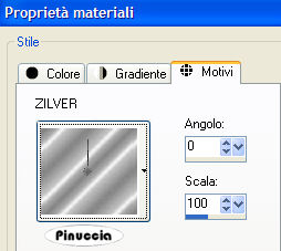 17. Immagine>Aggiungi bordatura, 2 pixels, simmetriche, con il colore bianco. Seleziona il bordo con la bacchetta magica ![]() Riempilo con il motivo Zilver (nello zip).Aprilo in PSP e sarà subito disponibile nell'elenco dei Motivi della paletta materiali. ![]() 18. Immagine>Aggiungi bordatura, 1 pixel, simmetriche, con il colore nero. Livelli>Nuovo livello raster. 19. Nella paletta dei materiali, imposta il colore #f2ebe9 come colore di primo piano e il motivo argento (Zilver) come colore di sfondo. Attiva lo strumento Testo , font Bonzai,