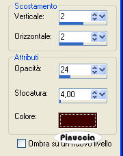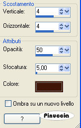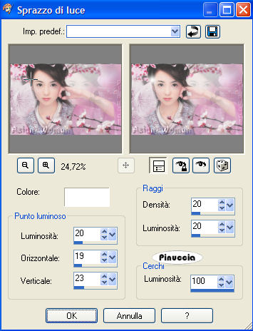 pennellata 1, direzione del testo orizzontale verso il basso,![]() Scrivi Asian woman in basso a sinistra. (vedi la tag finale). 23. Effetti>Effetti 3D>Sfalsa ombra, con gli stessi settaggi del passo 20. Selezione>Nessuna selezione. 24. Nella paletta dei livelli cambia la modalità di miscelatura in Luminanza (esistente). ![]() Livelli>Unisci>Unisci tutto (appiattisci). 25. Effetti>Effetti di illuminazione>Sprazzo di luce, (colore Bianco). ![]() Il blend è finito. Salva in formato jpg. ![]() Se hai problemi o dubbi, o trovi un link non funzionante, o anche soltanto per un saluto, scrivimi. Settembre 2006 |