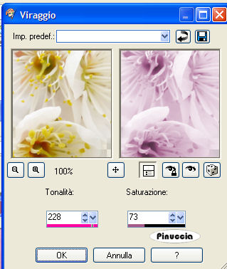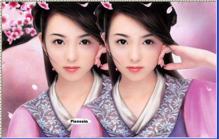 qui puoi trovare qualche risposta ai tuoi dubbi. Se l'argomento che ti interessa non è presente, ti prego di segnalarmelo. Questo tutorial è stato realizzato con PSP 9. Occorrente: Materiale qui Filtri: Xero qui FM Tile Tools qui 1. Apri i tubes. Duplicali (Shift+D) e chiudi gli originali. Metti il materiale nelle rispettive cartelle. 2. Apri l'immagine "Chinoise bemofen", duplicala 2 volte e chiudi l'originale. Attiva una delle due immagini. Con lo strumento Lasso così impostato:![]() 3. Traccia un contorno come mostrato qui sotto: ![]() 4. Quando hai finito, vai a Modifica>Copia Attiva la seconda immagine e vai a Modifica>Incolla>Incolla come nuovo livello. Con lo strumento Spostamento ,spostala leggermente sulla destra, come mostrato qui di seguito: ![]() 5. Nella paletta dei livelli abbassa l'opacità di questo livello al 20%. ![]() Dovresti avere questo: ![]() 6. Apri il tube "Tube_Yuna_Fleur30" e vai a Modifica>Copia. Torna al tuo lavoro e vai a Modifica>Incolla>Incolla come nuovo livello. Spostalo in basso sulla destra.(vedi la tag finale). 7.Apri il tube "Tube_Yuna_Fleur31" e vai a Modifica>Copia. Torna al tuo lavoro e vai a Modifica>Incolla>Incolla come nuovo livello. Spostalo sul lato sinistro del ritratto.![]() 8. Andiamo a colorizzare questo tube. Regola>Saturazione e tonalità>Viraggio. ![]() 9. Rimani posizionato sul livello del "Tube_Yuna_Fleur31" Effetti>Plugins>FM Tile Tools / Blend Emboss, con i settaggi standard. ![]() Livelli>Nuovo livello raster. 10. Nella paletta dei colori, imposta come colore di primo piano #f2ebe9. Attiva lo strumento Pennello ![]() Cerca il pennello di testo "cb-prose3" e applicalo in alto a destra. ![]()