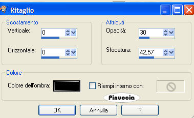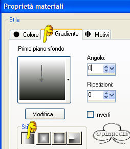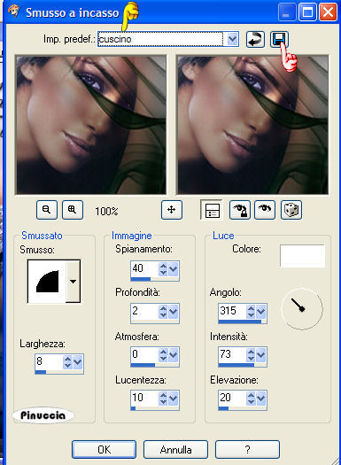 Questo tutorial è stato creato con PSP 8.1, ma può essere eseguito anche con le altre versioni. Occorrente: 3 tubes. Puoi usare i tuoi o questi 1. Apri una nuova immagine trasparente 600 x 450. Imposta il colore di primo piano con #1A1E16, e il colore di sfondo con #FEFEFE. Passa il colore di primo piano a Gradiente di primo piano/sfondo, stile lineare, angolo 0, ripetizioni 0. ![]() Se stai usando i tuoi tubes, scegli un colore scuro per il primo piano e uno chiaro come colore di sfondo. 2. Livelli>Nuovo livello raster. Riempi il livello con questo gradiente.3. Livelli>Nuovo livello raster. Selezione>Seleziona tutto. Apri il tube del velo (MTm_tramsparante tube-39) e vai a Modifica>Copia. Torna al tuo lavoro e vai a Modifica>Incolla>Incolla nella selezione. 4. Apri il tube della donna /Yoka_Mistedbeauty) e vai a Modifica>Copia. Torna al tuo lavoro e vai a Modifica>Incolla>Incolla come nuovo livello. Spostalo a sinistra.5. Apri il tube dei papaveri (poppy4-2layers). Immagine>Ridimensiona, a 450 pixels di altezza, tutti i livelli selezionato. ![]() 6. Posizionati sul livello del papavero più grande e vai a Modifica>Rifletti. Modifica>Copia. 7. Torna al tuo lavoro e vai a Modifica>Incolla>Incolla come nuovo livello. Spostalo a destra.Usa lo strumento Deformazione ![]() per posizionarlo. Nella paletta dei livelli abbassa l'opacità a tuo piacimento. La mia è al 95%. 8. Ritorna al tube del papavero e posizionati sul livello del papavero più piccolo. Modifica>Copia. 9. Torna al tuo lavoro e vai a Modifica>Incolla>Incolla come nuovo livello. Sempre con lo strumento Deformazione mettilo accanto al papavero più grande.Di nuovo abbassa l'opacità a tuo piacimento. 10. Livelli>Unisci>Unisci visibile. 11. Scegli un bel font e scrivi un testo in alto. Io ho usato Sheer Elegance, dimensione 30, colore di sfondo #1A1E16. Effetti>Effetti 3D>Sfalsa ombra, con i seguenti settaggi, colore #1a1e16: ![]() 12. Livelli>unisci>unisci tutto. 13. Immagine>aggiungi bordatura, 1 pixel, simmetriche, con il colore #1A1E16. 14. Immagine>Aggiungi bordatura, 5 pixels, simmetriche, con il colore rosso. Seleziona il bordo con la bacchetta magica ![]() e riempilo con un bel Gradiente argento metallizzato.Effetti>Effetti 3D>Smusso a incasso, e usa il preset cuscino. Se non hai il preset, sarà sufficiente copiare i settaggi della schermata qui sotto. Per salvare il preset, clicca sull'icona indicata dalla manina rossa e salva l'impostazione. ![]() Selezione>Inverti. Effetti>Effetti 3D>Ritaglio, con i seguenti settaggi, colore nero. ![]() Selezione>Nessuna selezione. 15. Immagine>Aggiungi bordatura, 1 pixels, simmetriche, con il colore #1A1E16. 16. Immagine>Ridimensiona, alla misura originale. 17. Aggiungi la firma e hai finito. ![]() Se hai problemi o dubbi, o trovi un link non funzionante, o anche soltanto per un saluto, scrivimi. 6 Settembre 2006